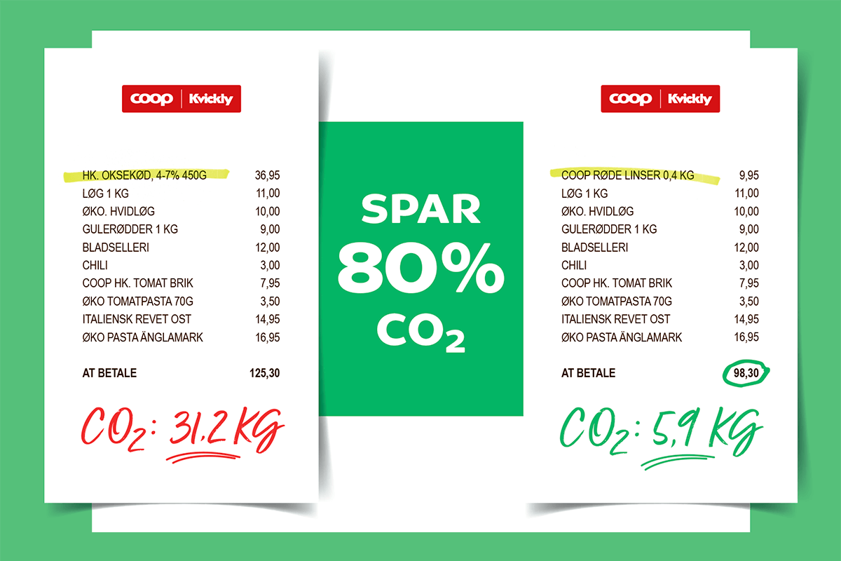 Da du kun bruger halvdelen af linserne i din ret, så bliver klimabelastningen endnu mindre, hvis du sammenligner de to færdige retter. Her udleder du kun 1/8 CO2 i forhold til den med oksekød. Og så er der også penge at spare, når man skifter kødet ud med grøntsager eller linser. Se blot de to boner (vejledende priser fra 2019)