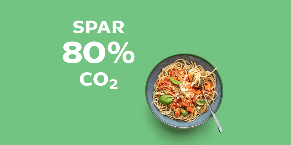 Tag en klassisk spaghetti med oksekød, grøntsager, tomatsovs og revet ost på toppen. Hvis du erstatter 450 gram hakket oksekød i sovsen med røde linser, så udleder du kun 1/5 CO2 i dit indkøb.