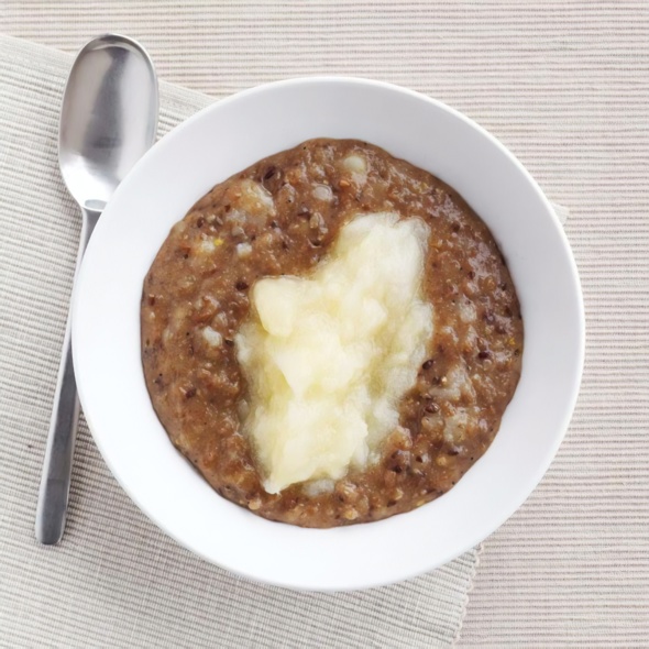 Brug rugbrødsrester til en lækker øllebrød og kog nogle dejlige danske æbler til mos. Så får du en god og mættende start på dagen.
