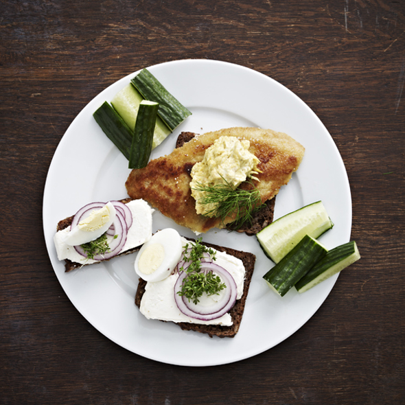 21Server pr. voksen: 1 skive rugbrød med fiskefilet, 1 ½ skive rugbrød med æg og 120 g agurk i stave