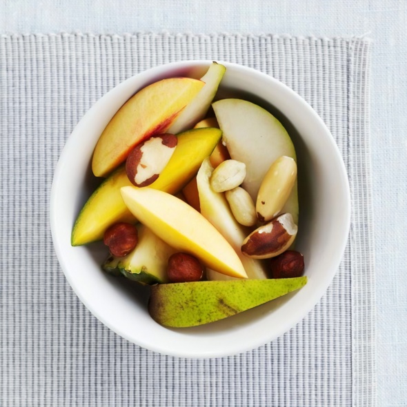 Vælg frugter og nødder i sæson som æbler, pærer, blommer og hasselnødder. Frugt og nødder er et let mellemmåltid om aftenen fyldt med vitaminer og mineraler.