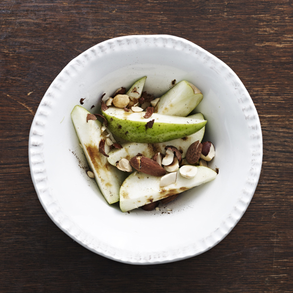 4Vend pærerne i honning og derefter i nødderne.