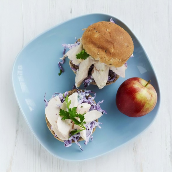 Fuldkornsbolle med kylling, rødkål og persilledressing