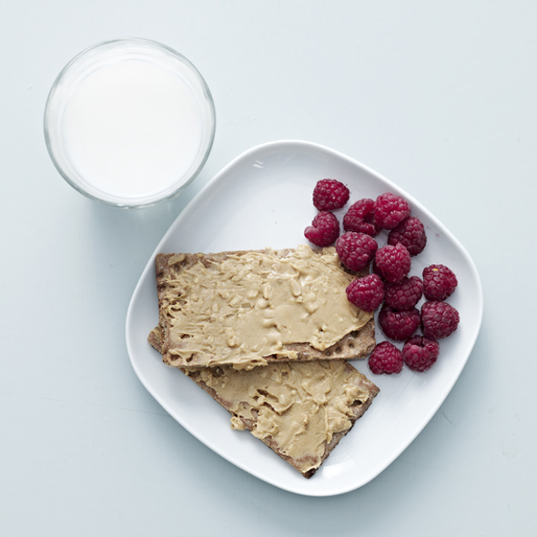 Nyd et stykke groft knækbrød med fed peantbutter og friske søde bær