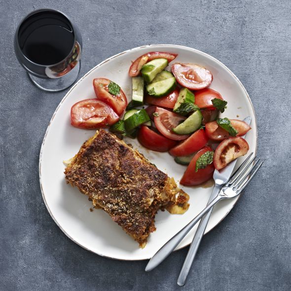 21Servering:Pr voksen: 300 g fuldkornslasagne, 30 % af tomatsalaten og 1 glas rødvin