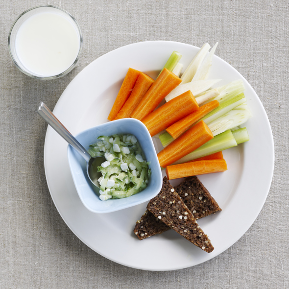 Grøntsager med hytteostdip, ristet rugbrød og et glas mælk stiller sulten og slukker tørsten. Hytteost er et magert alternativ til skæreost.