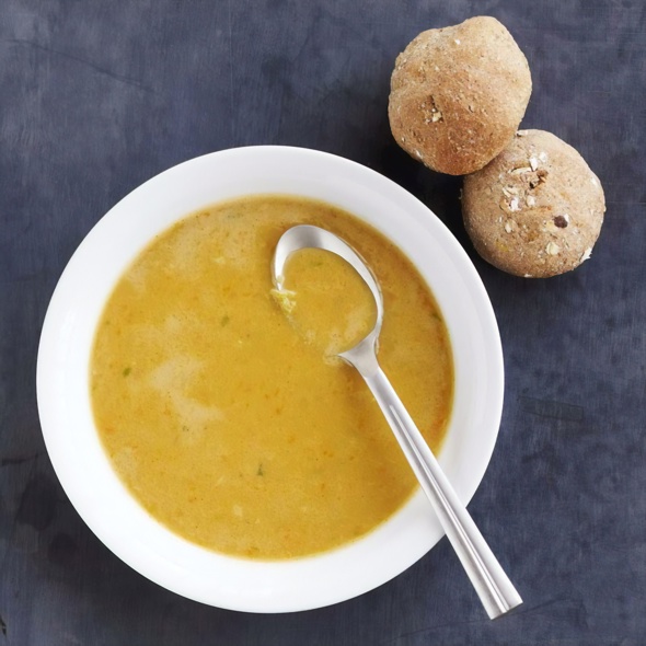 Lav en fyldig suppe af de grøntsager, du har i skuffer, køleskab og fryser. Spis grove rugboller til. Så har du et sundt mellemmåltid.