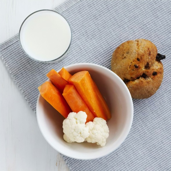 22Servering:Spis én bolle med gulerod og blomkålsbuketter. Drik et glas mælk til.