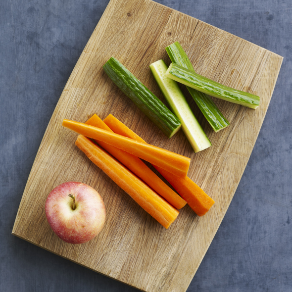 Brug de grøntsager og frugter, du har. Skift for eksempel æble ud med pære, og agurk med peberfrugt.