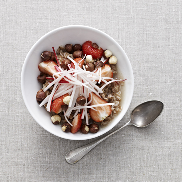 14Kom jordbær, rabarber, honning, hasselnødder og en klat skyr på toppen af grøden.