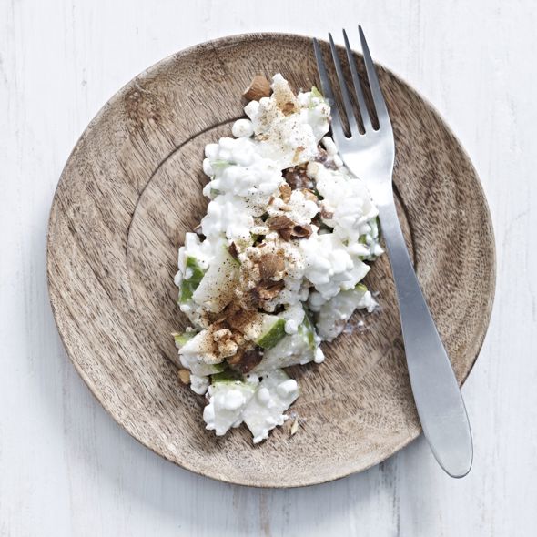 Hytteost er et magert surmælksprodukt, der mætter godt, fordi det indeholder meget protein. Bland med mandler og frugt.