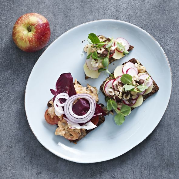 1Ristet rugbrød med makrelsalat:Læg rugbrød på en brødrister og rist brødet på begge sider