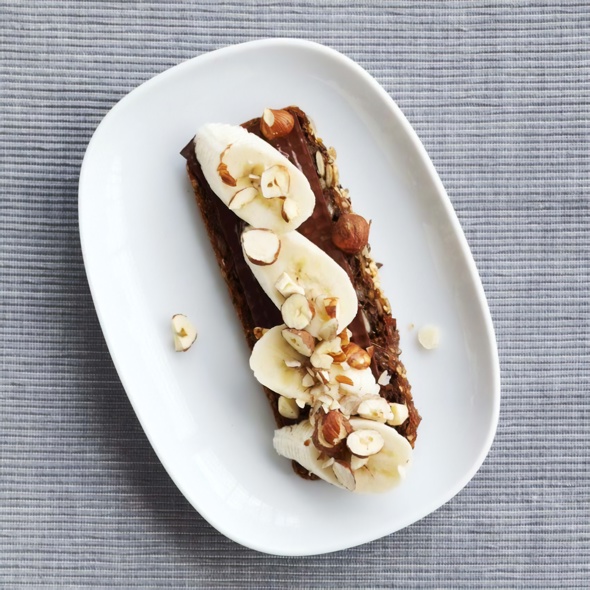 Ristet rugbrød med mørk pålægschokolade, banan og et drys af nødder smager skønt og er et lækkert og mættede mellemmåltid.