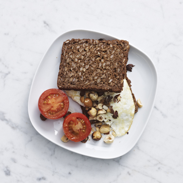 12Kom æg på rugbrødet, drys med hakkede hasselnødder og server tomaten på siden.
