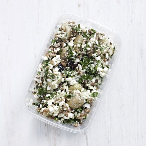 6Bland hvedekerner, kartofler, krydderurter, citronskal og citronsaft, hytteost, rosiner og rapsolie i en stor skål