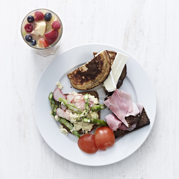 25Asparges, røræg og grillet toast:Slå æggene ud i en skål