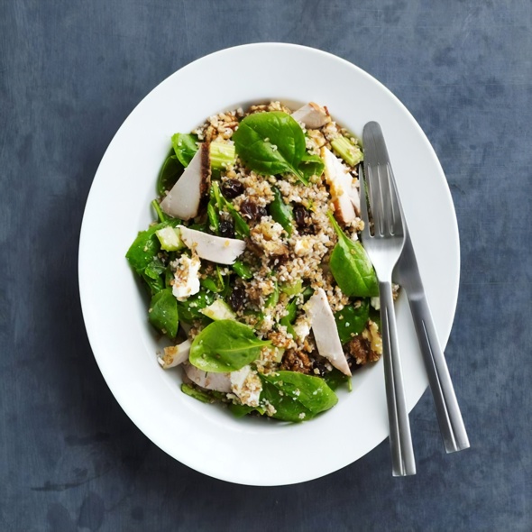 9Bland bulgur, spinat, blegselleri, valnødder, feta, rosiner og svinekød