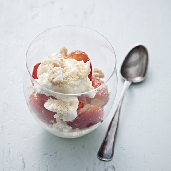5Kom jordbær på makronerne, dernæst flødeskum og makroner